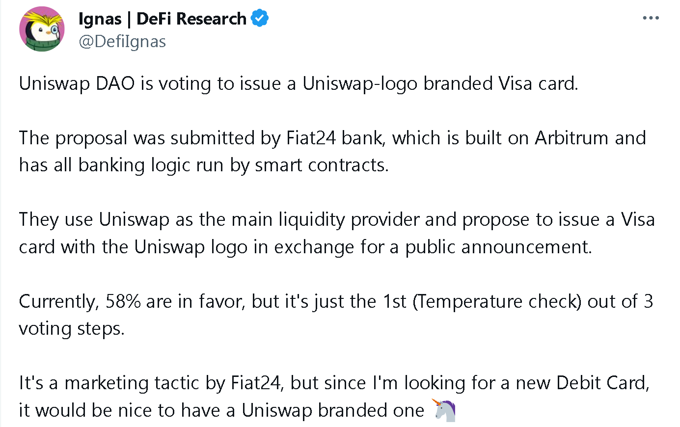 10 月 23 日晚,Pink Brains 联合创始人 @DefiIgnas 发推表示,「Uniswap DAO 正在投票发行带有 Uniswap 标志的 Visa 卡。该提案由基于 Arbitrum 构建的 Fiat24 银行提交,所有银行业务逻辑均由智能合约运行。Fiat24 使用 Uniswap 作为主要流动性提供者,并提议发行带有 Uniswap 标志的 Visa 卡,以换取公开公告。」