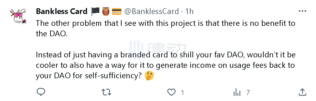 此外,也有网友在这场讨论中注意到,DAO 在这次风波中得不到好处。@BanklessCard 表示,「与其只用一张品牌卡来推销你最喜欢的 DAO,不如有一种方法让它通过使用费产生收入回到你的 DAO 以实现自给自足,不是更酷吗?」