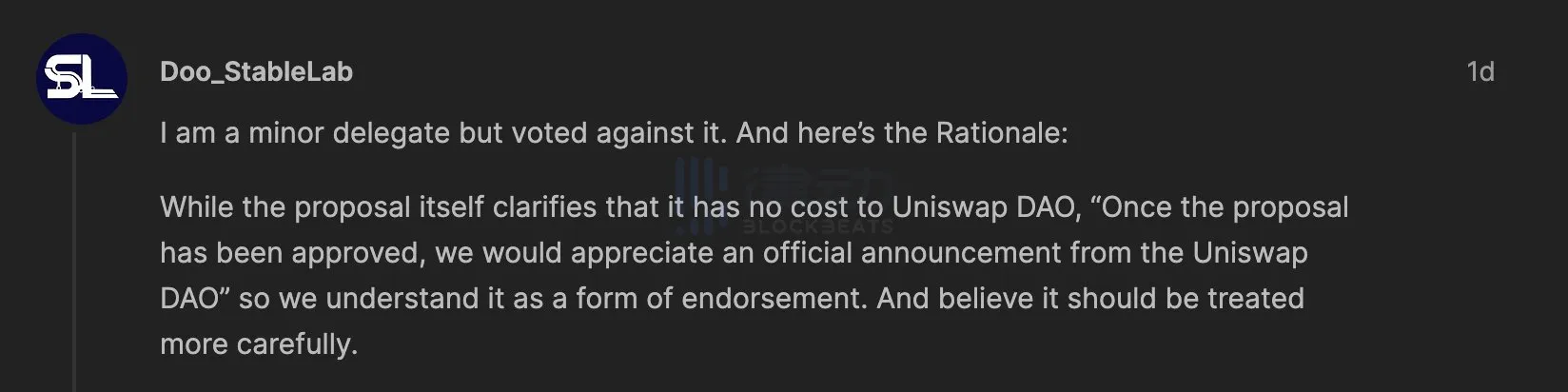 Uniswap 代表兼密歇根区块链治理负责人 Abdullah Umar 在治理论坛上表示:「投票反对这项提案——尽管这个想法很巧妙,但我认为 DAO 没有太多发言权。」「除非 DAO 获得某种商标许可或白标授权,否则这项提案不应获得通过。」