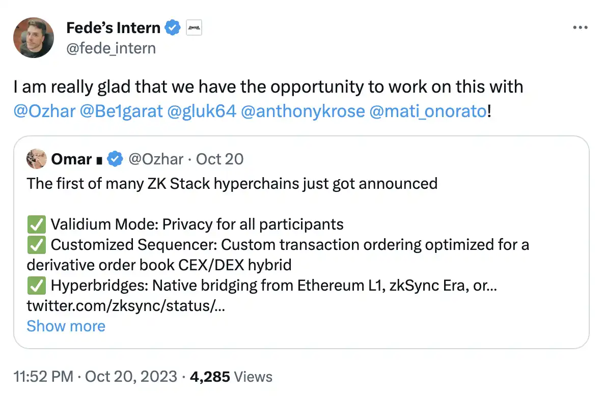 LambdaClass CEO Federico 转发 zkSync 的生态商务负责人 Omar 的推文表示很荣幸参与这次合作。由 zkSync「hyperchain」的项目内容及 LambdaClass 的业务背景可以推测出,LambdaClass 在此次合作中负责了「hyperchain」的开发工作。