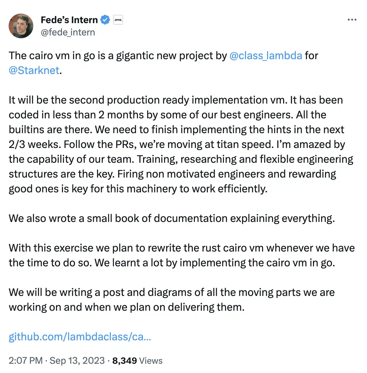 LambdaClass CEO Federico Carrone 在社交媒体上称「团队工程师在不到两个月的时间内就完成了 cairoVM 的编码」。