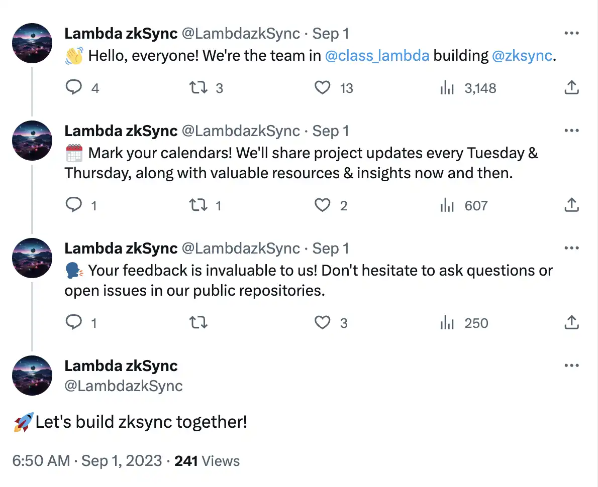 在 X 上,有许多「LambdaClass Starknet」的矩阵账号,LambdaClass 的 Starknet 团队官方账号的粉丝数量是 LambdaClass 的 zkSync 团队粉丝数量的三倍。这段合作关系才刚刚开始,未来将会碰撞出怎么样的技术火花,我们静候佳音。