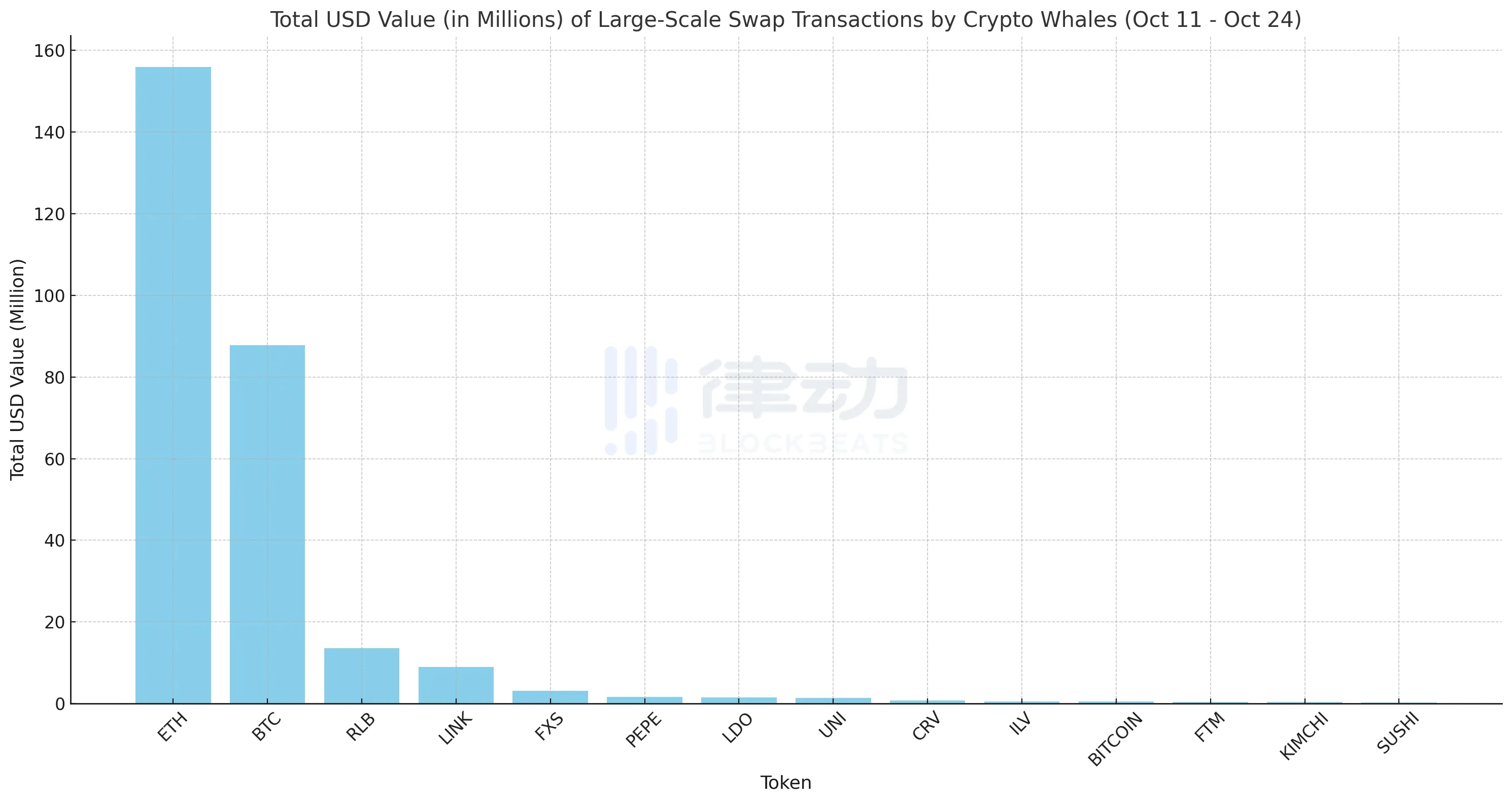 在 0xScope 的数据帮助下, 整理了在 10 月 11 日到 10 月 24 期间(也就是比特币近期最低位 26000 美元到涨至 35000 美元期间)以太坊链上单笔 swap 交易额超过 30 万美元的巨鲸持仓买卖动向,来看看巨鲸们近期都买/卖了哪些代币。