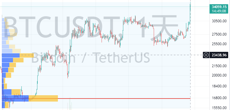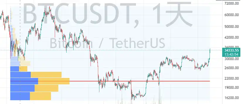 以下图为例,我们选取了自 2022 年 11 月 9 日至今的价格变化区间来观察成交量分布,即 FTX 崩溃时造成的底部至今日价格突破 35,000 美元价格的最高点。
