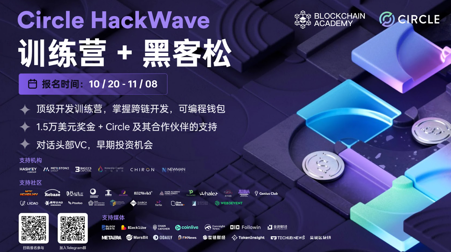 2023 年 10 月 24 日 - Blockchain Academy 与区块链科技界巨头 Circle 携手推出了 Circle HackWave 训练营+黑客松,旨在引领未来数字金融的发展。此次活动为开发者提供了独特的机会,让他们深入了解 Circle 生态系统,构建去中心化应用,并推动创新的发展。