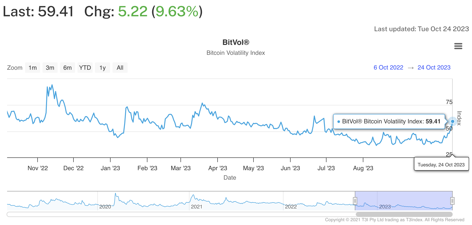 消息,10 月 25 日,由金融指数公司 T3 Index 联合比特币期权交易平台 LedgerX 推出的 BitVol(比特币波动)指数昨日升至 59.41,日涨幅 9.63%。