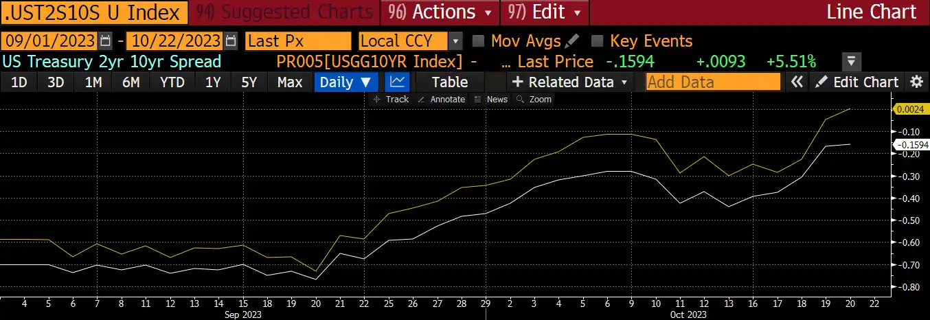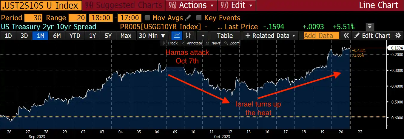 拜登一再重申美国将支持以色列,但随着战争成本不断攀升,美国国债市场重新开始下跌。收益曲线再度出现向熊市加息的趋势。没有发生什么引人注目的事情,然后加沙最大的医院被轰炸。