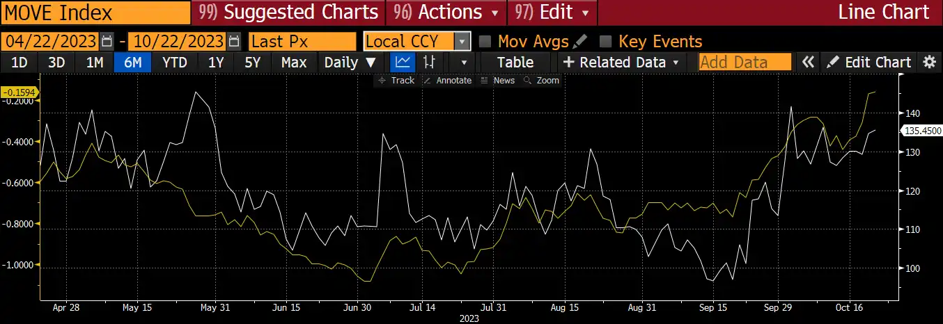 MOVE 指数(白色),2 年期减 10 年期收益率差(黄色)