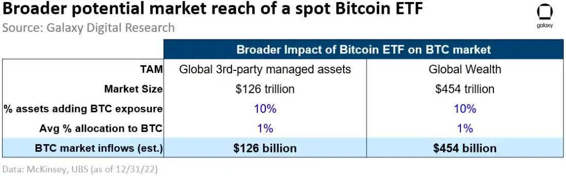 然而,比特币 ETF 的可获得市场以及比特币 ETF 批准的间接影响和覆盖范围可能远远超出美国财富管理渠道(例如,国际市场、零售市场、其他投资产品和其他渠道),并可能吸引更多资金流入比特币现货市场和投资产品。