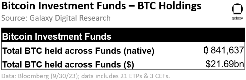 截至 2023 年 9 月 30 日,包括 ETPs 和封闭式基金在内的投资产品中持有的比特币总量为 842,000 枚比特币(资产管理规模达 217 亿美元),占总发行供应的 4.3%。
