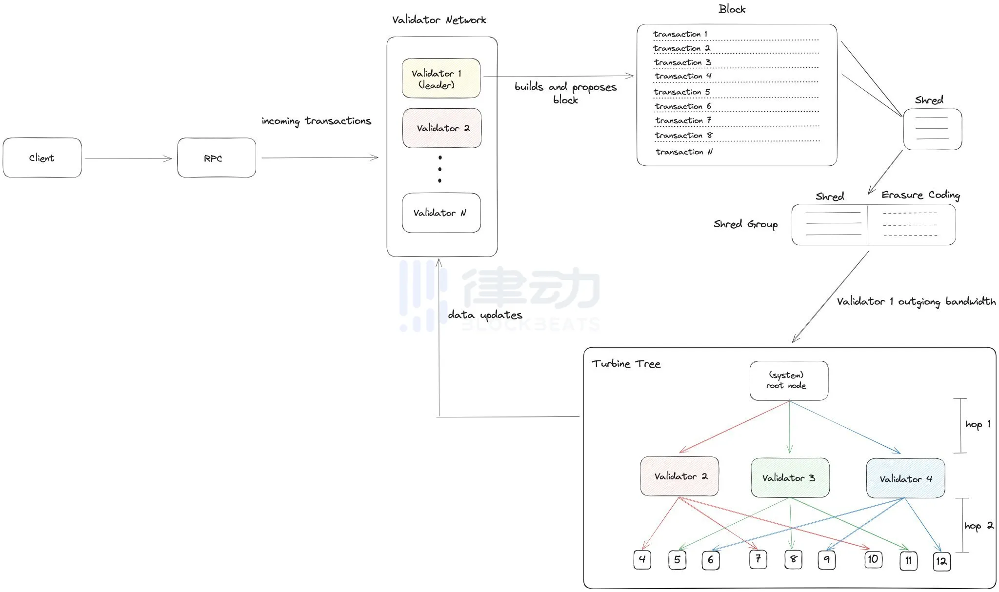 在传播区块之前(即传输到网络中的其他验证器),领导者根据传入的交易流构建并排序该区块。区块构建完成后,就可以通过 Turbine 将其发送到网络的其余部分。这个过程称为区块传播。『