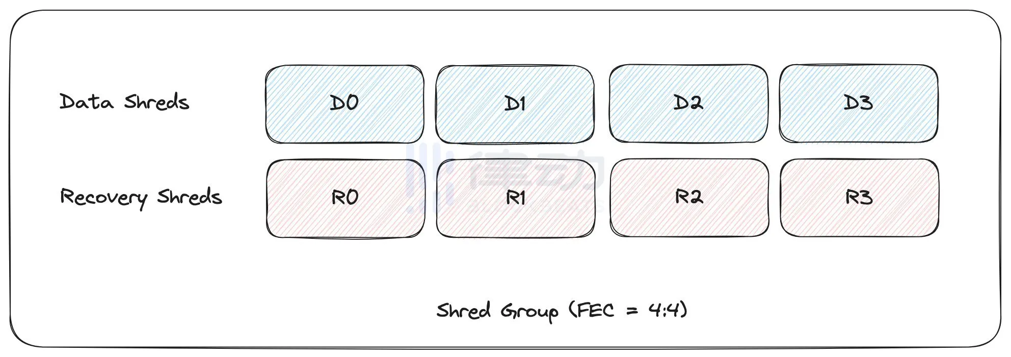 在通过 Turbine 树传播碎片之前,首先使用里德-所罗门擦除编码(Reed-Solomon erasure coding,一种基于多项式的错误检测和纠正方案)对它们进行编码。纠删码作为一种数据保护方法,即使在传输过程中某些部分丢失或损坏,也可以恢复原始数据。Reed-Solomon 纠删码是一种特定类型的前向纠错 (FEC) 算法。