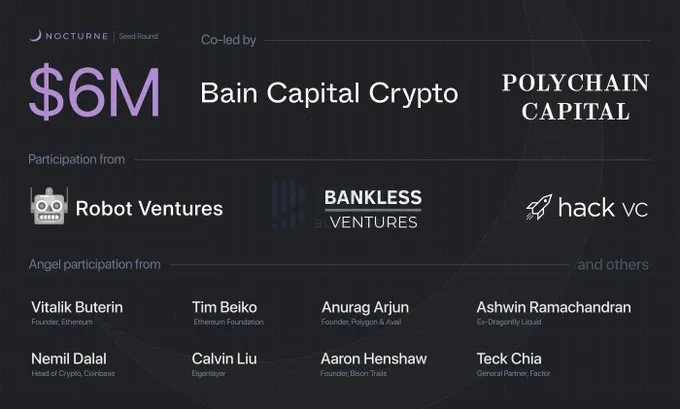 10 月 25 日,加密初创公司 Nocturne Labs 完成 600 万美元种子轮融资,本轮融资由 Bain Capital Crypto 与 Polychain Capital 共同领投,以太坊联合创始人 Vitalik Buterin、Bankless Ventures、Hack VC、Robot Ventures 等参投。