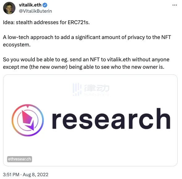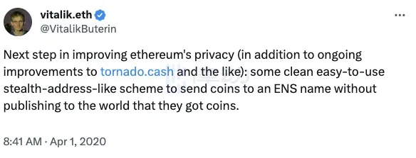 这不是 Vitalik 第一次提出隐形地址的概念,2020 年 3 月,Vitalik 提出了与以太坊名称服务(ENS)兼容的隐形地址方案。2022 年 8 月,Vitalik 提议使用隐形地址隐藏所有者身份的私人 NFT。