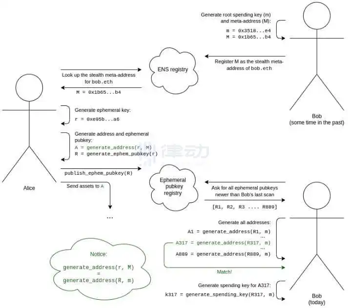 也可以理解为,隐形地址提供与 Bob 为每笔交易生成新地址相同的隐私属性,但不需要 Bob 进行任何交互。