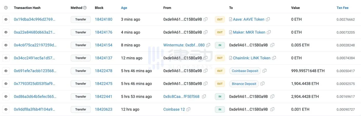 10 月 25 日,据 Lookonchain 监测,FTX 和 Alameda 资产接收钱包通过 0xde9A 开头钱包地址,将 2904 枚 ETH(约合 518 万美元)、1,341 枚 MKR(约合 202 万美元)、11,974 枚 AAVE(约合 103 万美元)、198,804 枚 LINK(约合 226 万美元)转移到 Binance 和 Coinbase,这些资产价值共约 1049 万美元。