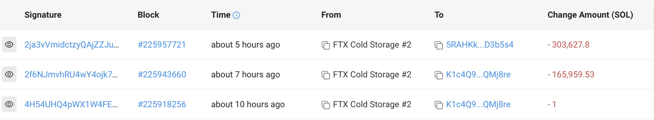 此外,据派盾(PeckShield)监测显示,Solana 上标记为「FTX Cold Storage」的地址已转出近 47 万枚 SOL(约 1500 万美元),其中一部分已转入 CEX。此外,FTX 相关地址将 1393 枚 ETH 转入 Coinbase(约 250 万美元)。