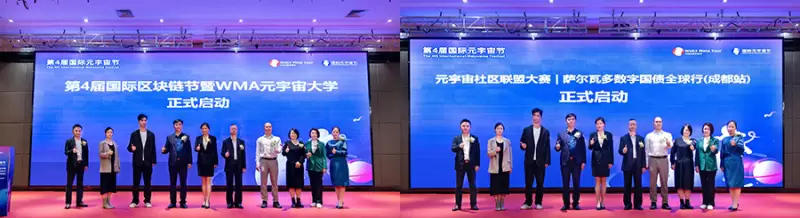 大会首先举行了第4届国际区块链节.国际元宇宙节暨世界元宇宙发展联盟元宇宙大学启动仪式和元宇宙社区联盟大赛暨萨尔瓦多数字国债全球行(成都站)启动仪式。