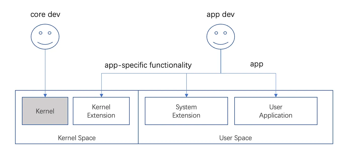 但 Mac OS X 允许应用开发者自主将程序部署进内核态,去扩展内核态的功能,而不需要 Mac OS X 的核心团队 case by case 去封装。Mac OS X 提供的核心机制是「内核扩展」和「系统扩展」,这两种扩展允许开发者在一定的安全模式下开发内核扩展,使用更高权限的功能,去开发纯用户态应用完成不了的功能。