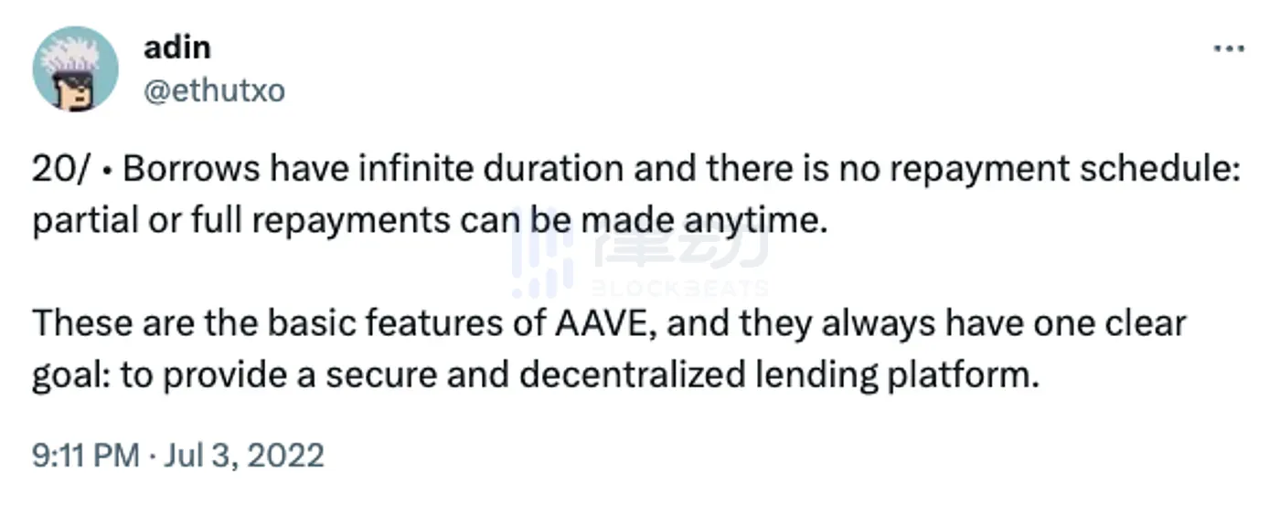 下面这个说法犯了一个典型的错误:Aave 贷款的期限不是无限的。事实上,恰恰相反。它们的持续时间为零(或更准确地说,一个区块的持续时间)。贷款会自动展期,这是一个很好的切换(segue)……