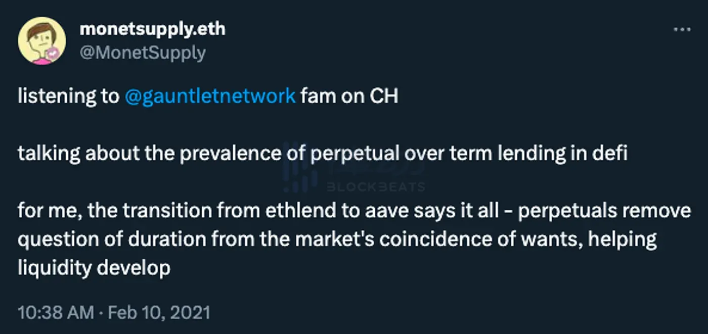 但你不会经常听到人们将 Aave 贷款称为「永续贷款」,因为它更像是一种退化的情况(在数学意义上,而不是交易者意义上)。