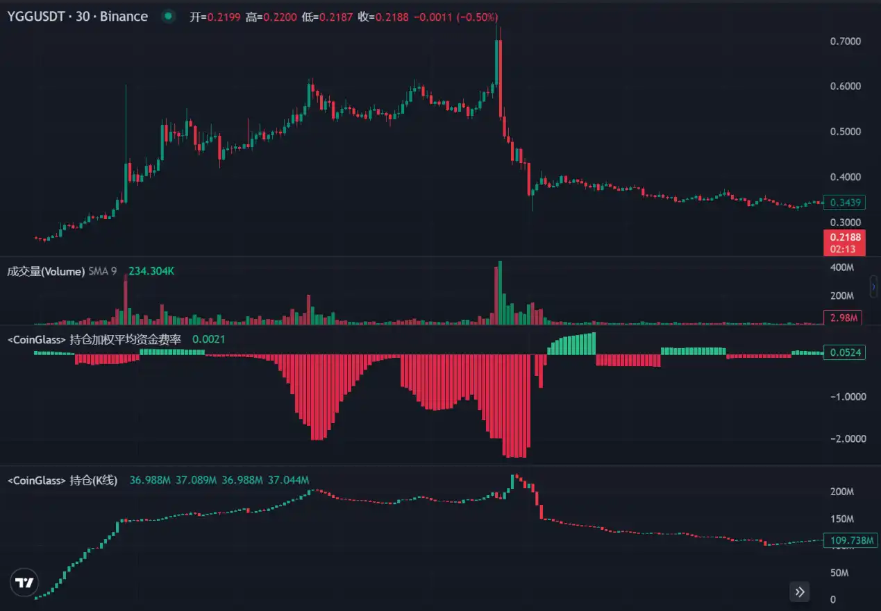 如果作为二级市场投资者,在 YGG 行情启动之初可以观察到合约数据的异常。YGG 的合约数据在早期表现出持仓量的暴涨,费率的稳定;在中期表现出持仓增长的放缓,费率的下降,在后期表现出多头平仓带来的持仓下降。
