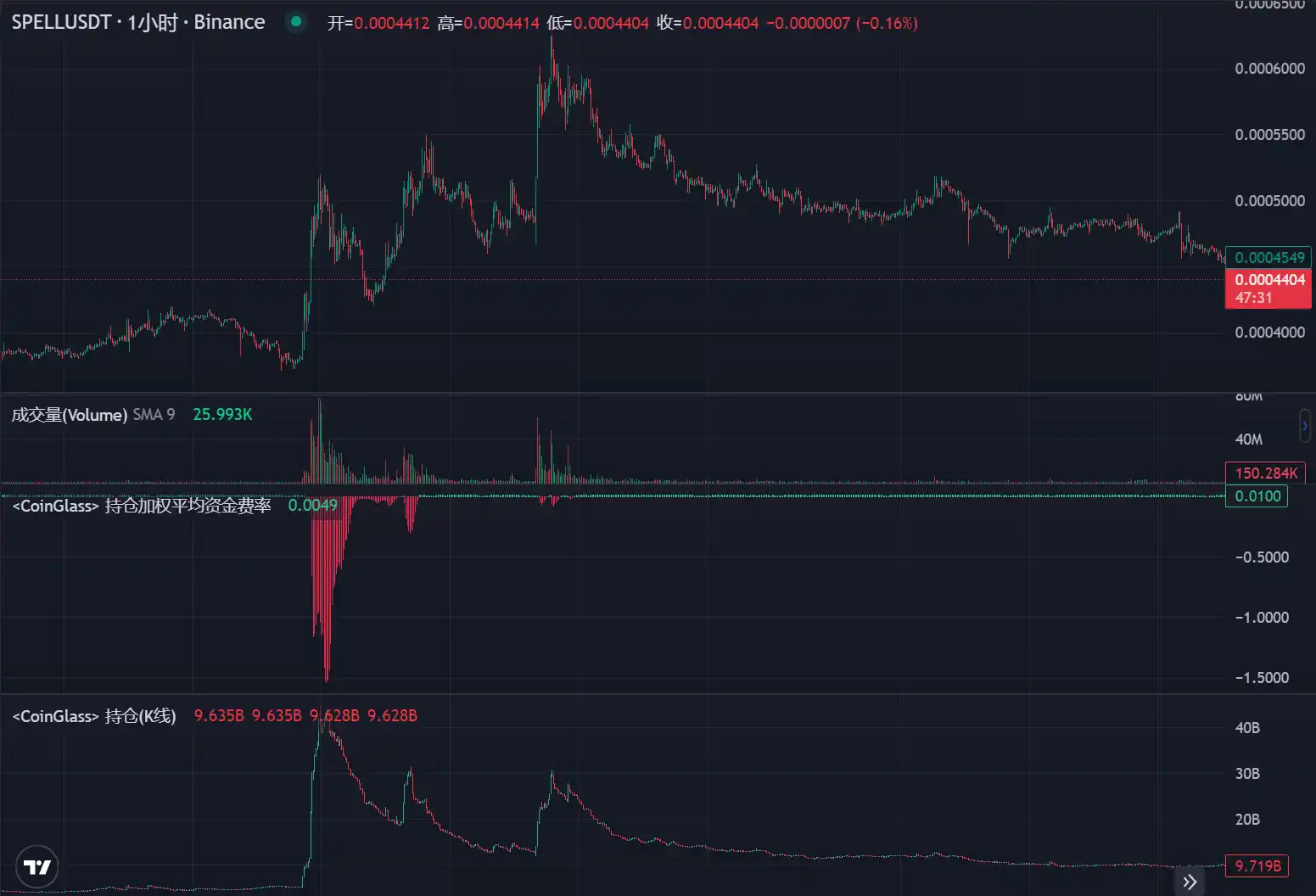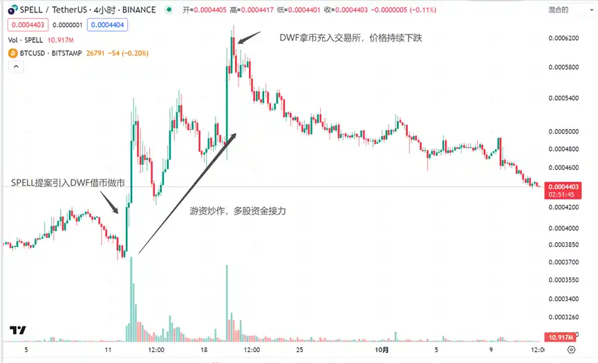 9 月 19 日 Abracadabra 向 DWF 提供了 3.3M 的 SPELL 贷款,随后 DWF 将其转入币安,SPELL 进入下跌通道,现报价 0.0004416,相较于前期高点已经下跌 31%。