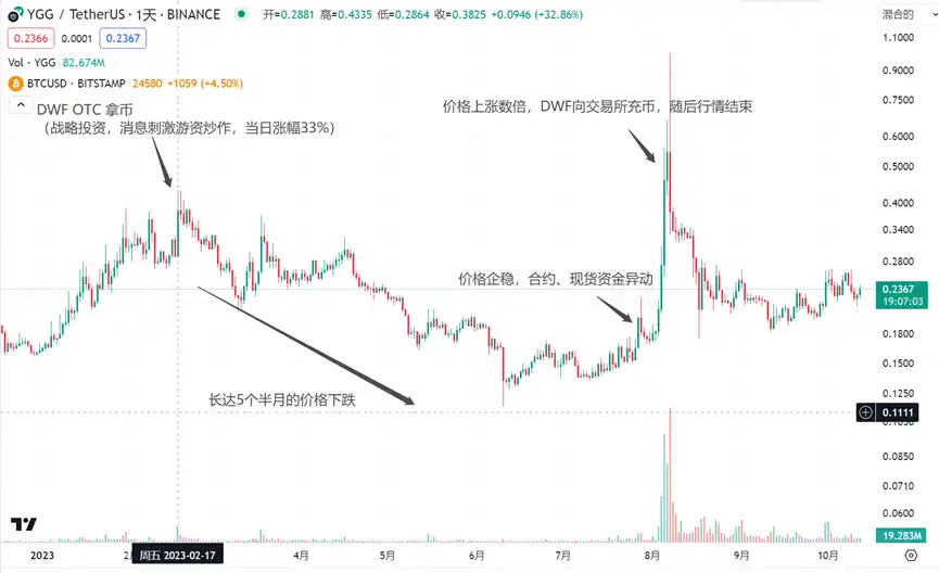 值得关注的是,DWF Labs 在 2 月 10 日就已经从 YGG 财库中收到 800 万枚 YGG,并于 2 月 14 日首次转入币安 70 万枚,2 月 17 日媒体报道投资信息,随后 DWF 又分两次于 6 月 19 日转入币安 365 万枚、8 月 6 日转入币安 365 万枚。结合 YGG 价格表现:2 月 17 日,YGG 受投资信息影响,当日最大涨幅 50%,收涨 33%;而后就开始了长达 5 个半月的下跌,直到今年 8 月初拉盘行情启动,YGG 相较前低涨超 7 倍,行情结束时伴随 DWF 将最后一笔 YGG 代币转入币安。