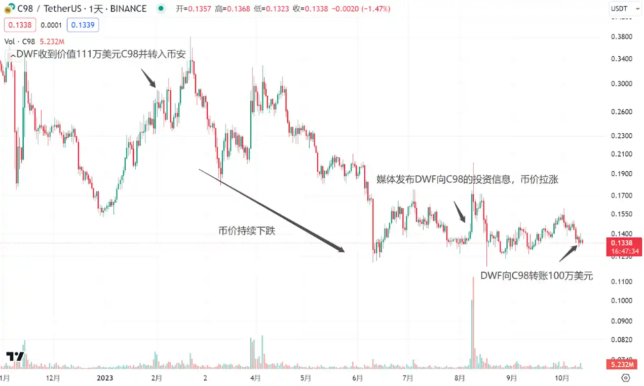 2023 年 2 月 2 日,DWF 链上地址收到从 Coin98 官方地址的转账,共计 412 万枚左右,按当日市价折算约 111 万美元(当日 C98 二级市场价格约为 0.27 美元),随后立即转入币安交易所;8 月 8 日,Coin98 宣布获得 DWF Labs 的七位数投资,以推动 Web3 的大规模采用;10 月 12 日,据媒体报道,DWF 向 C98 转账 100 万 USDT。结合 C98 价格表现,在 DWF 收到代币并转入交易所后,C98 短暂上涨后进入了长达 5 个月的下跌,8 月 8 日媒体发文价格两天时间较前低拉涨 58%,随后快速下跌。回顾该事件,其本质或为 DWF 向 C98 项目方 9 折拿币,而后二级市场抛售获利。