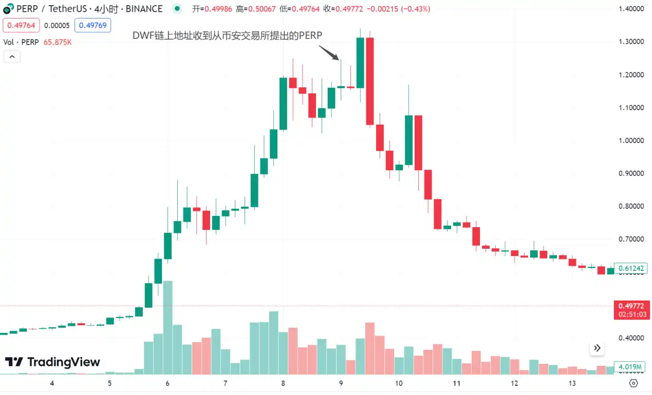 另,9 月 8 日,DWF 链上地址收到来自币安的 PERP 转账,此前 PERP 已经上涨数倍,在 DWF 出现交易所提币情况后,PERP 买盘明显增多,币价短暂拉高后伴随大额砸盘进入下跌通道,行情结束。