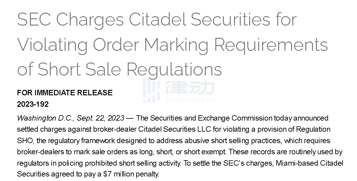今年 9 月 22 日,据官方公告,美国证券交易委员会(SEC)对做市商巨头 Citadel Securities 提起的指控已达成和解,SEC 指控 Citadel Securities 违反做空法规的订单标记要求。Citadel Securities 同意支付 700 万美元的罚款。