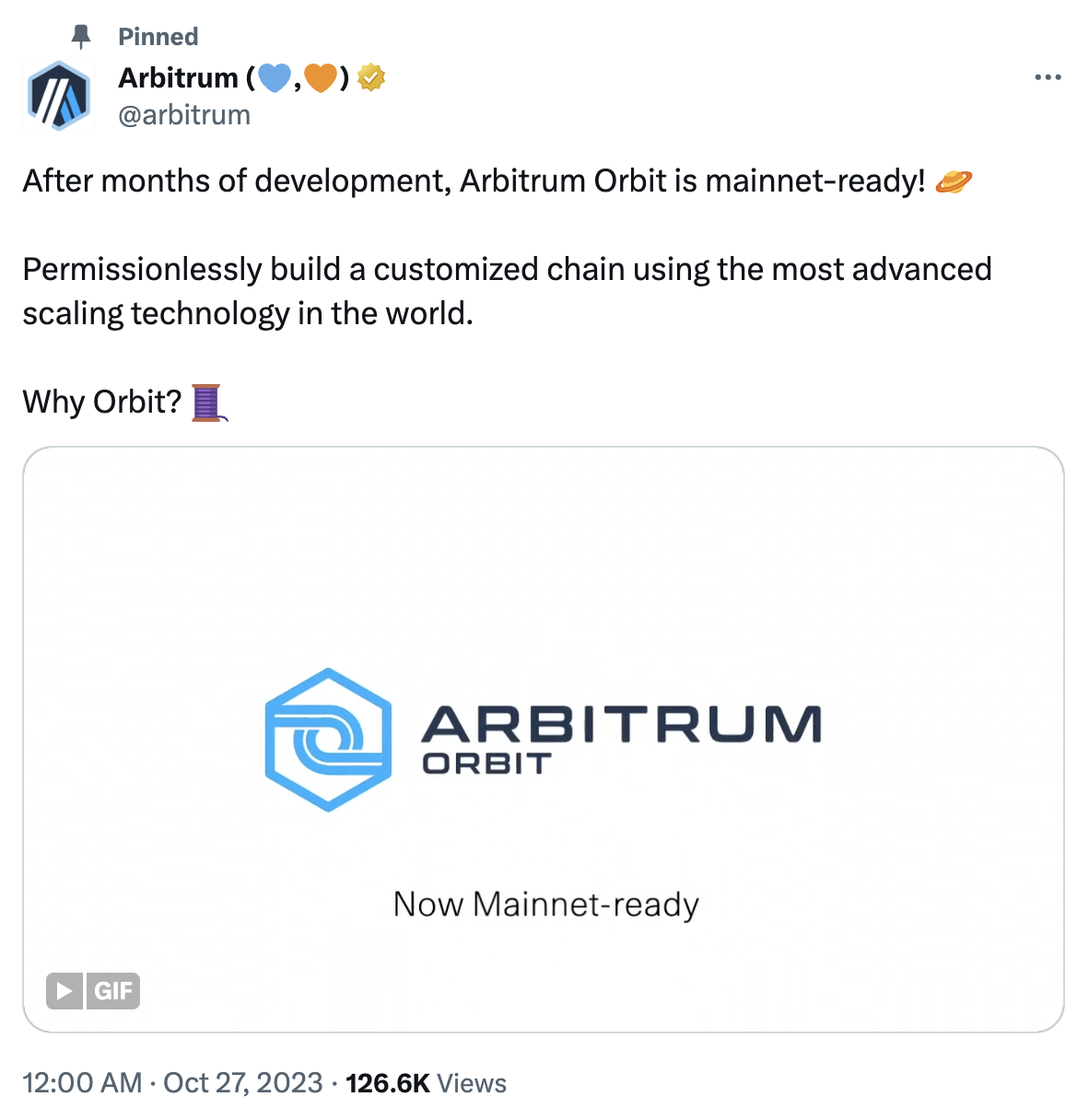 昨日,Arbitrum 基金会发布了一条「Tomorrow」的推文,暗示今天将发布重大公告。而今天据 报道,Arbitrum「Orbit」主网已准备就绪。