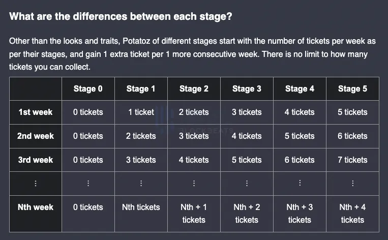 在 2022 年 7 月,Memeland 又推出了总量 9,999 个的「The Potatoz」系列,迎合了当时流行的「Free Mint 行情」,同时采用了分为 5 个阶段的「揭露-质押-奖励」机制,土豆 Potatoz 的形象被分为 5 个阶段进行揭露,需要持有者将他们的 NFT 质押后才能进化,在这个质押过程中 Memeland 也发放了大量的奖励,例如 MVP NFT、Potatoz NFT、IPhone 14、白名单等等,甚至奖品里还有「免费吃一年的麦当劳」。