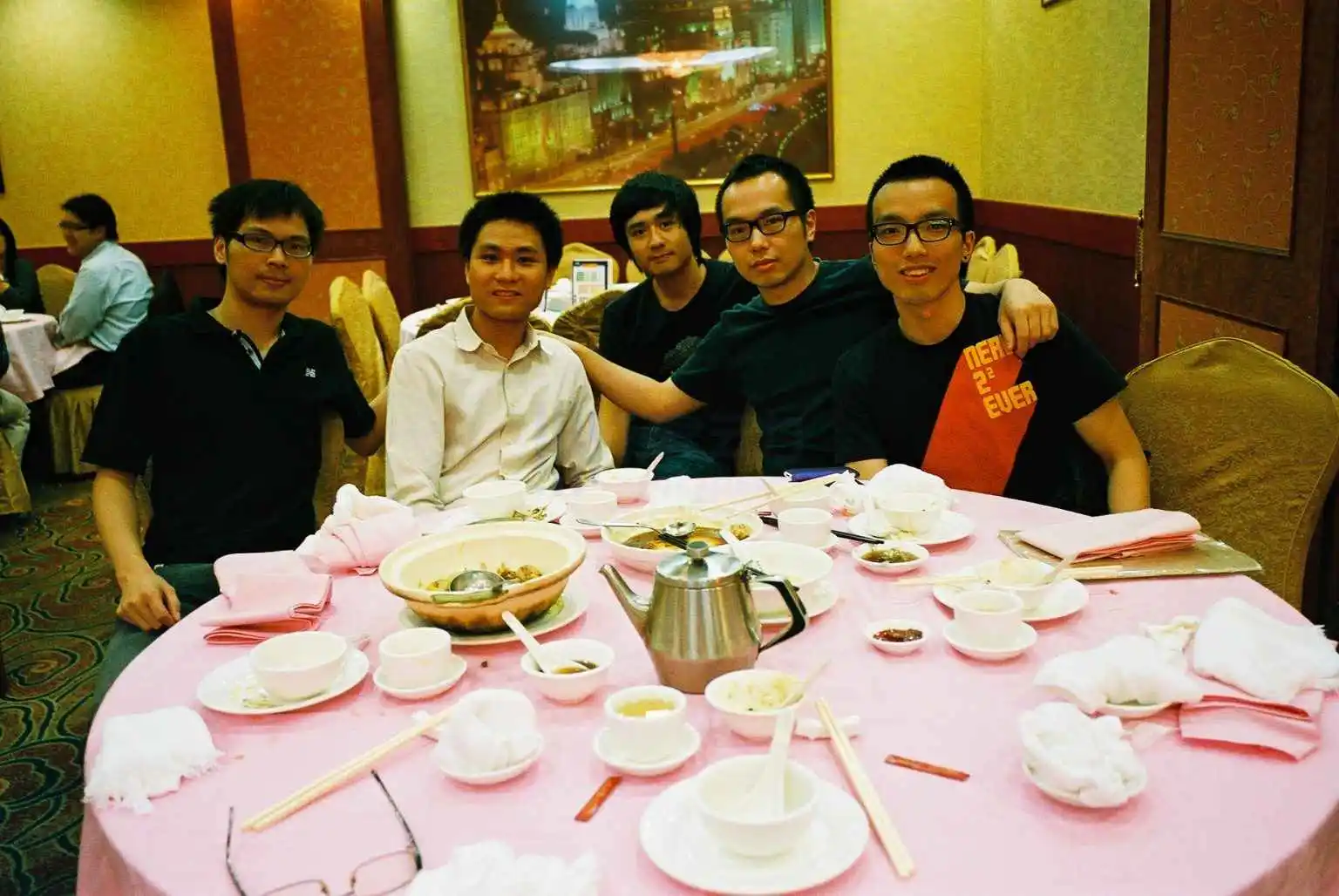 23 岁的的陈展程(右二)和自己的弟弟陈展俊(右一)、大学舍友、两个 aNobii 同事一起兼职创业