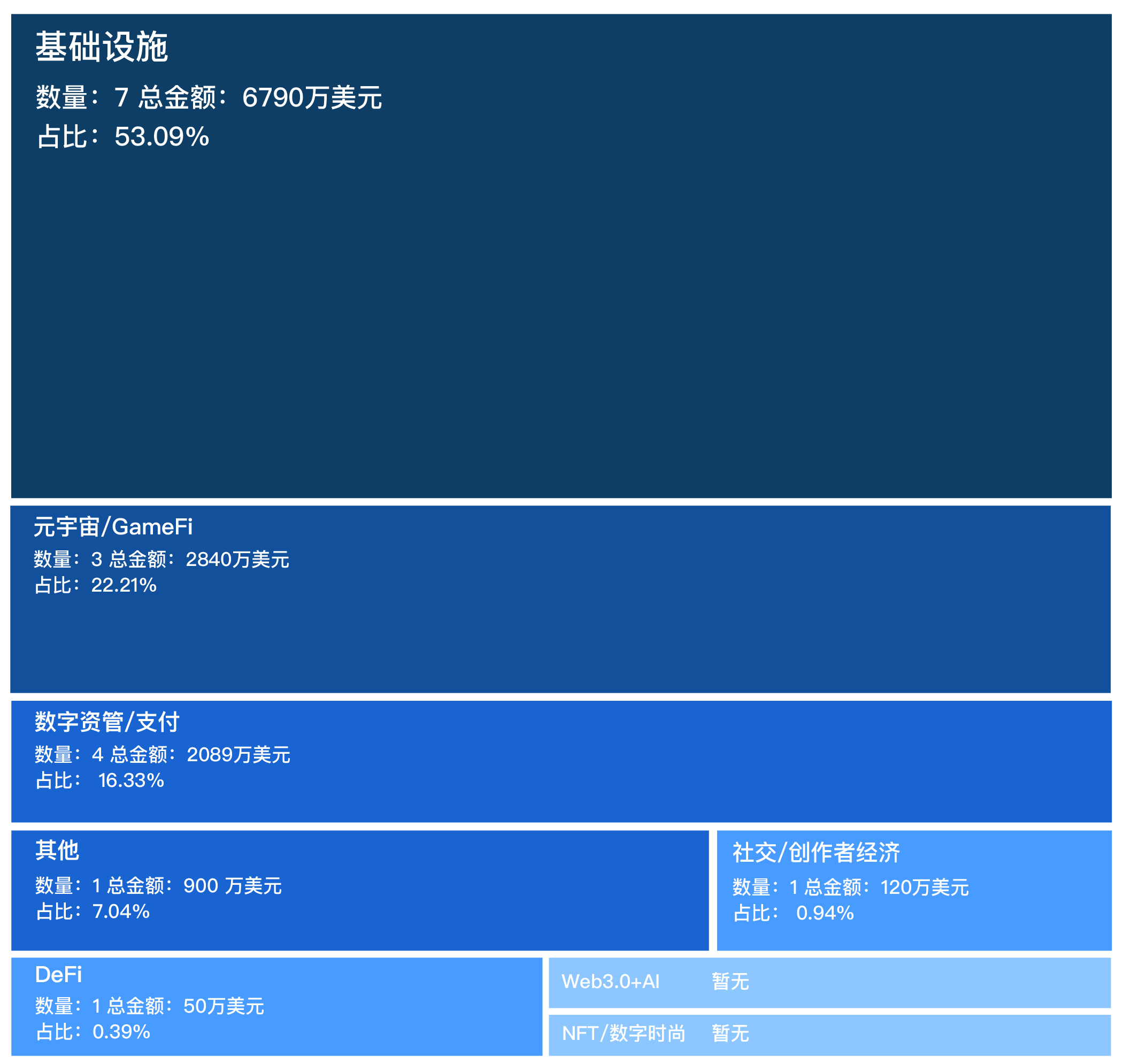 据 统计,上周的融资总数为 17 笔,数量较之前增加,总金额约为 12789 万美元,平均融资金额为 752.29 万美元。其中,基础设施领域占据主体,元宇宙/GameFi 领域相对较多,数字资管/支付领域增多,其他领域融资、社交/创作者经济领域和 DeFi 领域较少,NFT/数字时尚领域和 Web3.0+AI 领域暂无。下图为上周各板块融资占比: