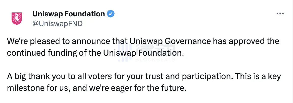 10 月 25 日,Uniswap 基金会于社交平台发文表示,治理社区已批准继续为 Uniswap 基金会提供资金。