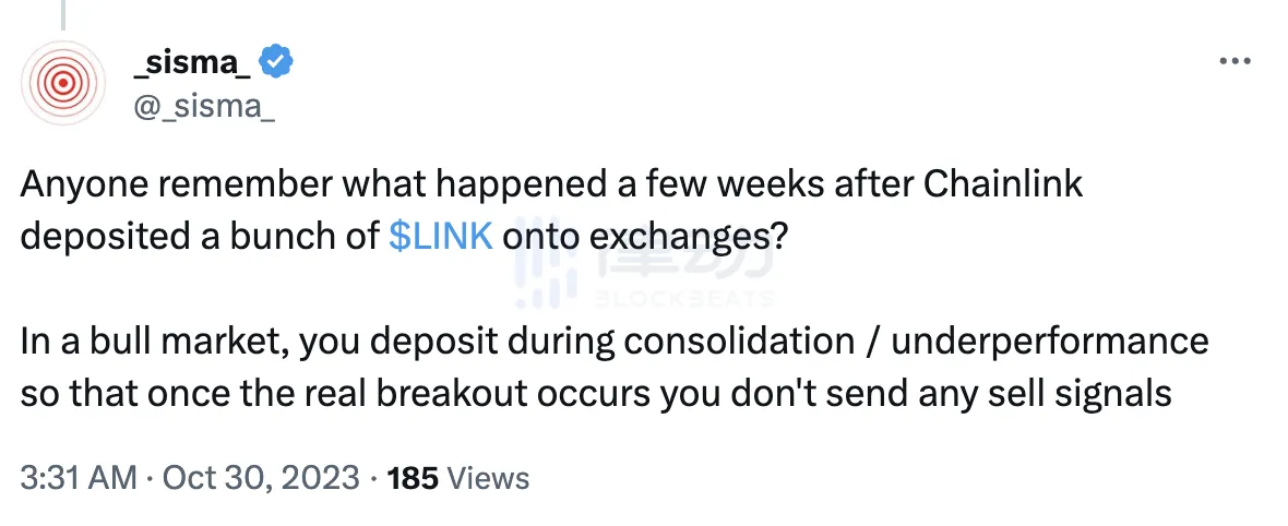 链上交易员 @_sisma_评论此轮卖币举动称「记得 Chainlink 将一堆 LINK 存入交易所后几周发生了什么吗?」9 月 16 日,据 The Data Nerd 数据监测,Chainlink 向 Binance 转入 1000 万枚 LINK(价值约合 6240 万美元)。随后,LINK 上涨了 55%,达到 8.3 美元。