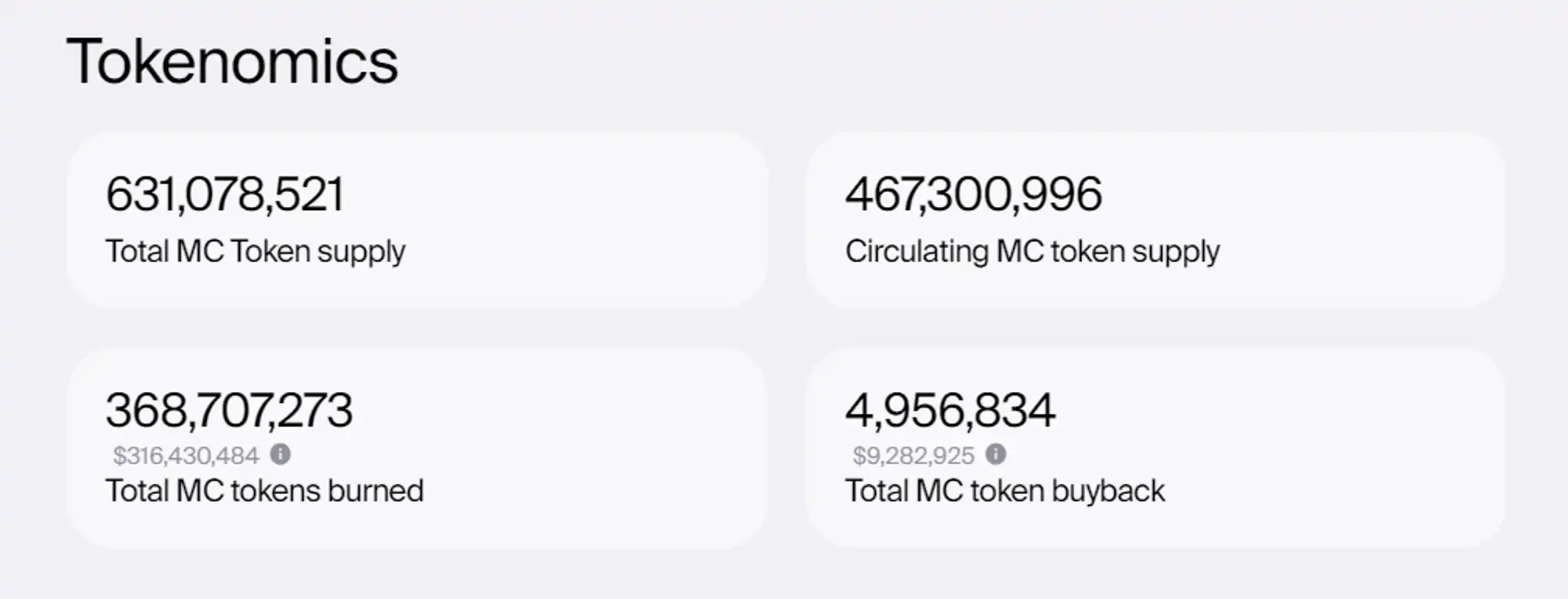 投资回购与燃烧:Merit Circle 将投资利润所得部分回购 MC 代币并进行销毁,减少 MC 的市场流通。目前共计 368,707,273 的代币退出流通。