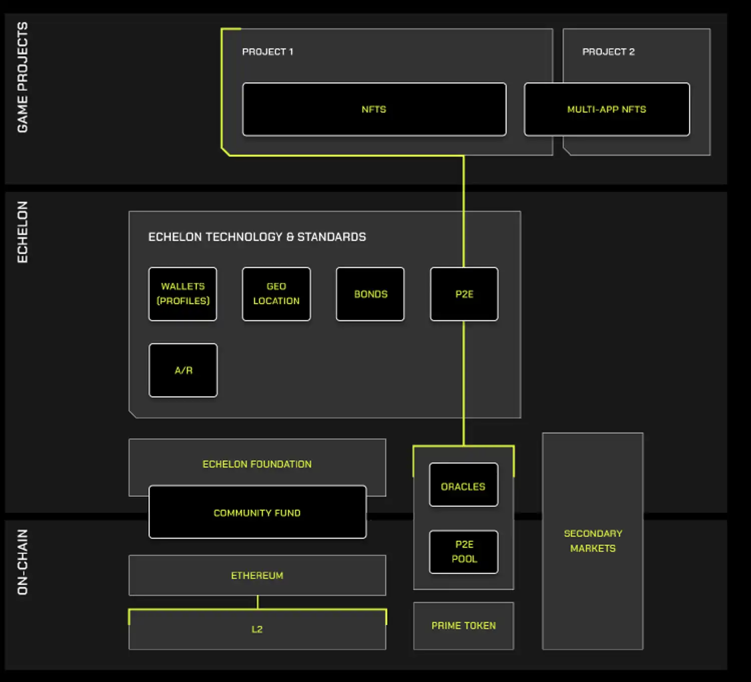 Echelon Prime 基金会由 Parallel 转型升级而来,是一个致力于发展游戏和 P2E 事业的生态系统,将为生态内的游戏提供基础设施以及共同的基础代币 PRIME,其旨在提供基础设施(包括用于钱包端安全通讯、端到端加密的 Inb0x,跨多游戏用户创立群组的 bond,专用的 NFT 分发机制,预言机等)以支持更大的游戏生态系统。Echelon 生态系统的结构如下图所示。