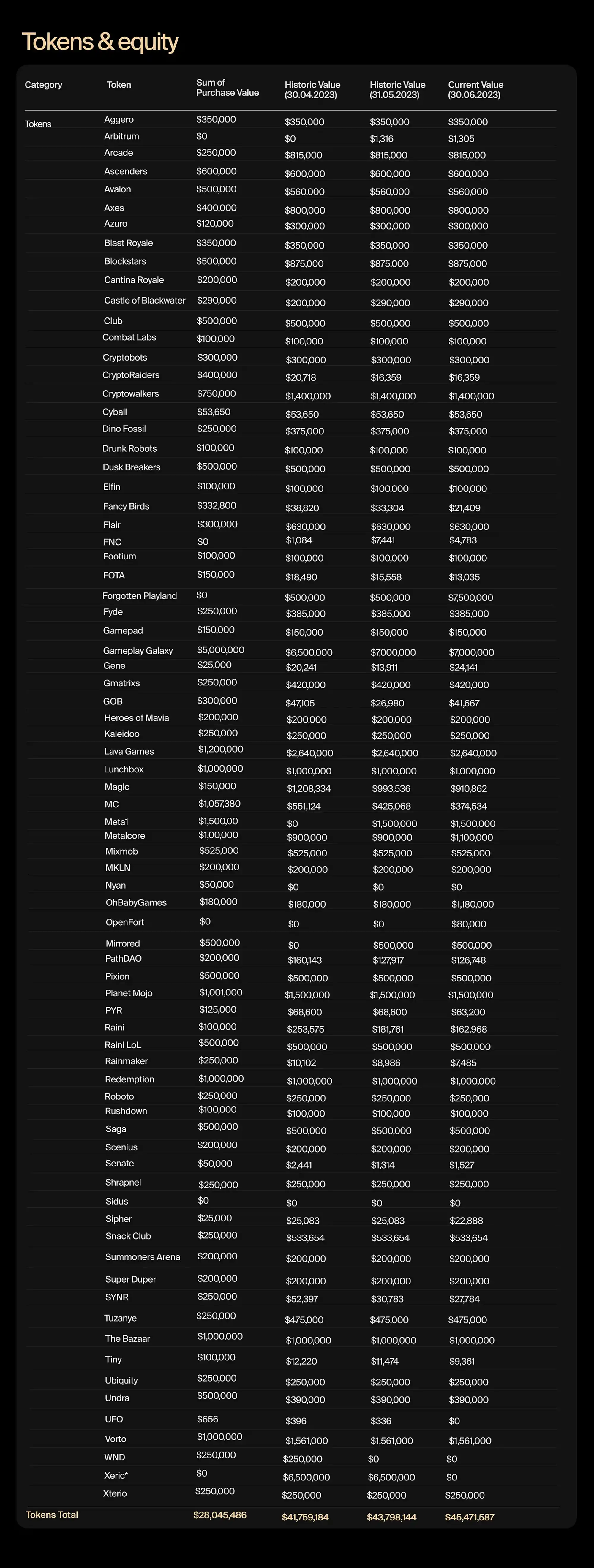 从国库资金分布和国库管理能力上看,Merit Circle 拥有大金额国库($94.1m),并在 Dashboard 中详细公开了其国库资金分布,截至 2023 年 6 月 23 日,AUM 距离 ATH 时降低了 25.49%,这在众多游戏公会中是相对极低的跌幅。目前国库资金中,稳定币总量$38.1m,占比 40.49%,其余主要为一级投资股权。根据 Defillama 数据,YGG 国库($123.77)中高达 94.05% 的代币为 YGG,抵抗风险的能力非常差,也因为 YGG 币价的大量下跌使得 YGG 国库 AUM 较 ATH 下降了 90% 多。