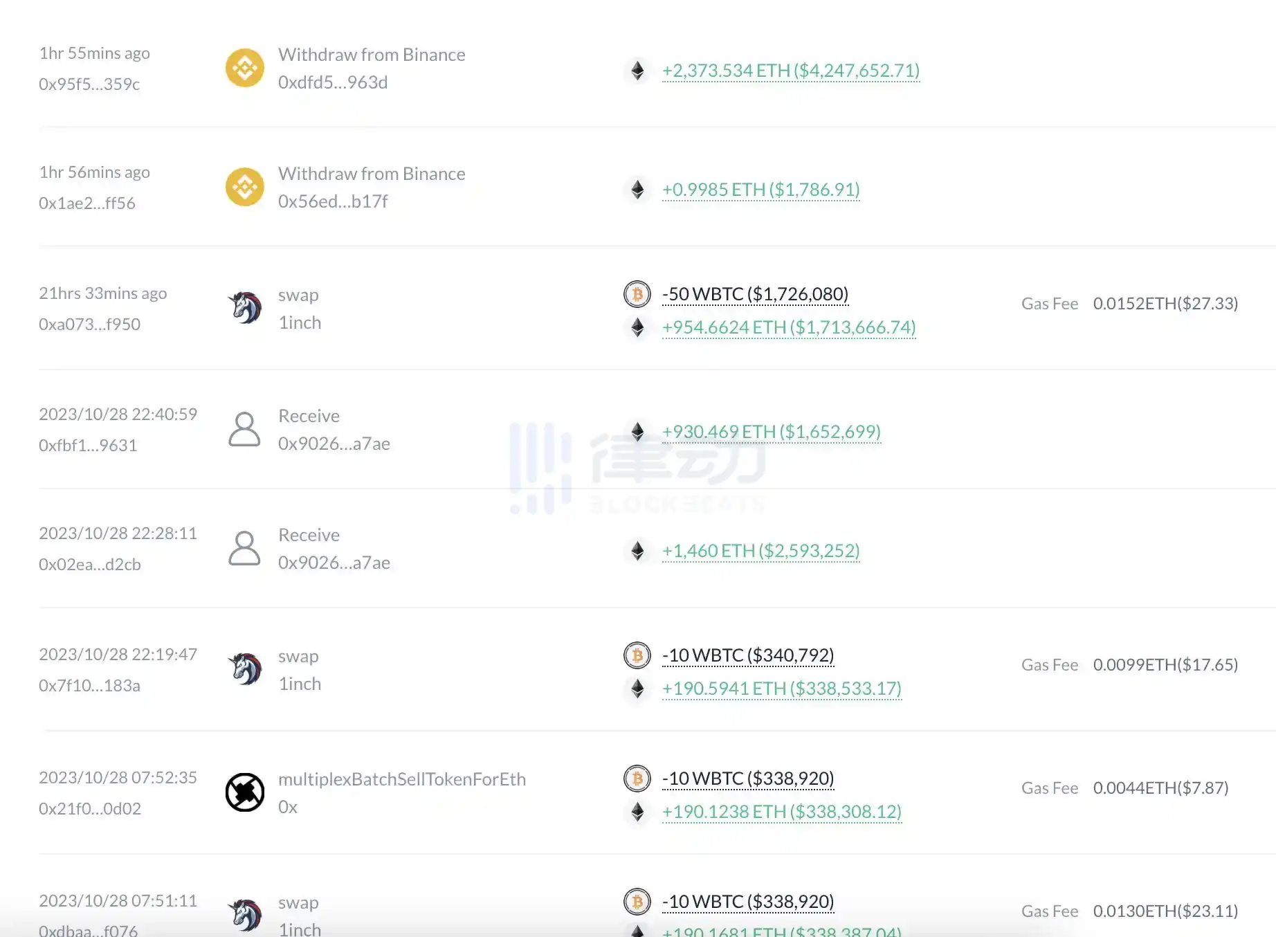 某鲸鱼地址 2 小时前从 Binance 提币 2374 枚 ETH,近 3 日将 100 枚 WBTC 兑换为 1526 枚 ETH