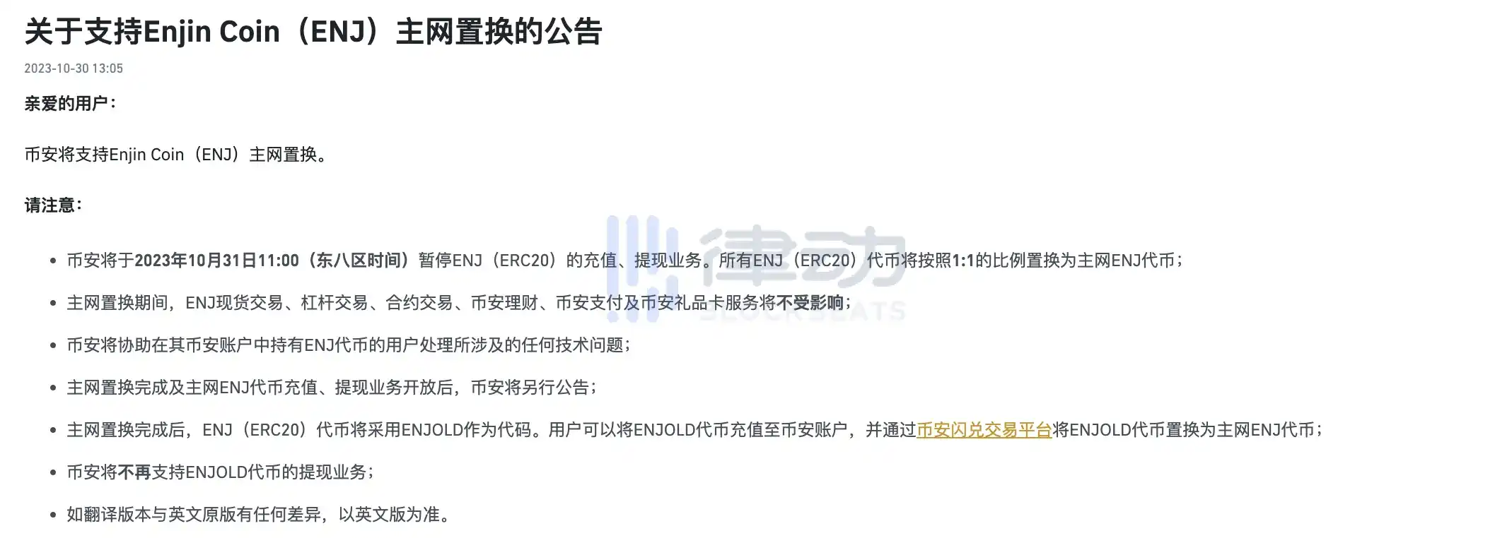 据官方公告,Binance 将支持 Enjin Coin(ENJ)主网置换。Binance 将于 2023 年 10 月 31 日 11:00(东八区时间)暂停 ENJ(ERC20)的充值、提现业务。所有 ENJ(ERC20)代币将按照 1:1 的比例置换为主网 ENJ 代币。