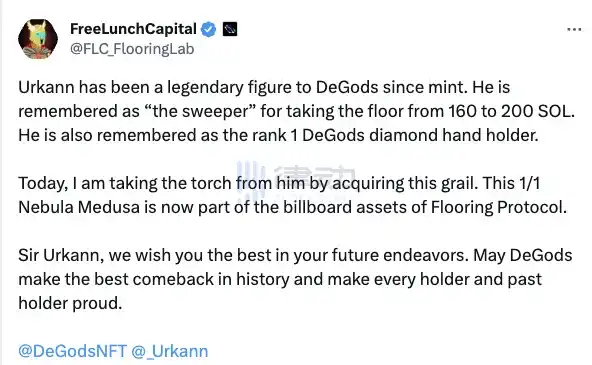 Flooring Protocol 创始人 FreeLunchCapital 在社交平台上表示,在周末以 110 ETH 的价格从另一位知名收藏家 Urkann 处购买稀有度排名第一的 DeGod #3251。