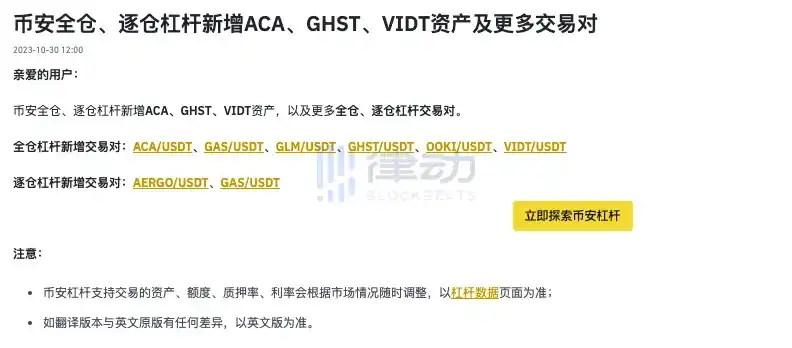 Binance 全仓、逐仓杠杆新增 ACA、GHST、VIDT 资产及 GAS/USDT 等交易对