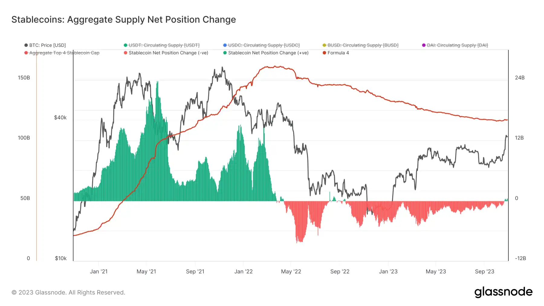 稳定币在流出放缓后,逐步收缩减弱的幅度,⽬前已有⼀定的购买⼒增量。
