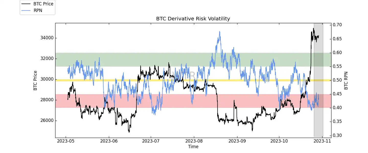 在上周⼤量轧空过后,当前⻛险系数已持续处于危险区域。单从⻛险系数的⻆度看,接下来衍⽣品交 易⻛险会有所提⾼。与此同时⻛险系数结合 fomo 情绪来看,价格当前可能会偏向于震荡或⼩幅度回调 摄取⼀定多头流动性后再次轧空。