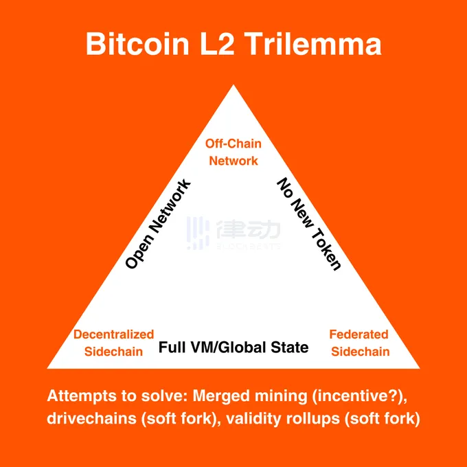 此前关于比特币 L2 三难困境(Bitcoin L2 Trilemma)的讨论已经很多了,在本周里该话题再次引起热议。比特币 L2 三难困境指的是在三个理想的属性中:开放网络;没有新 Token;full/global VM 中,开发人员只能选择任意两个。