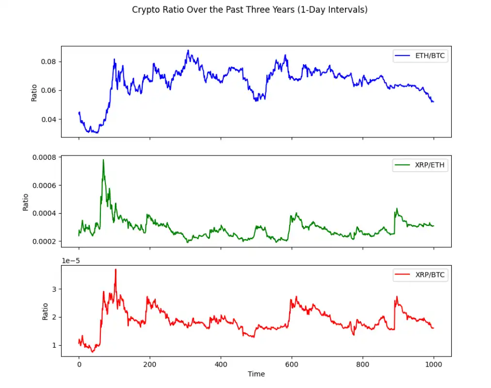 汇率合约通常呈现出一定的可预测性。例如,以 ETH/BTC 汇率为例,这一比率在一段时间内可能呈现出回归的趋势。这种可预测性使投资者能够更好地规划他们的交易策略。下图三个汇率合约 K 线的走势,清楚地展示了其均值回归的特性。