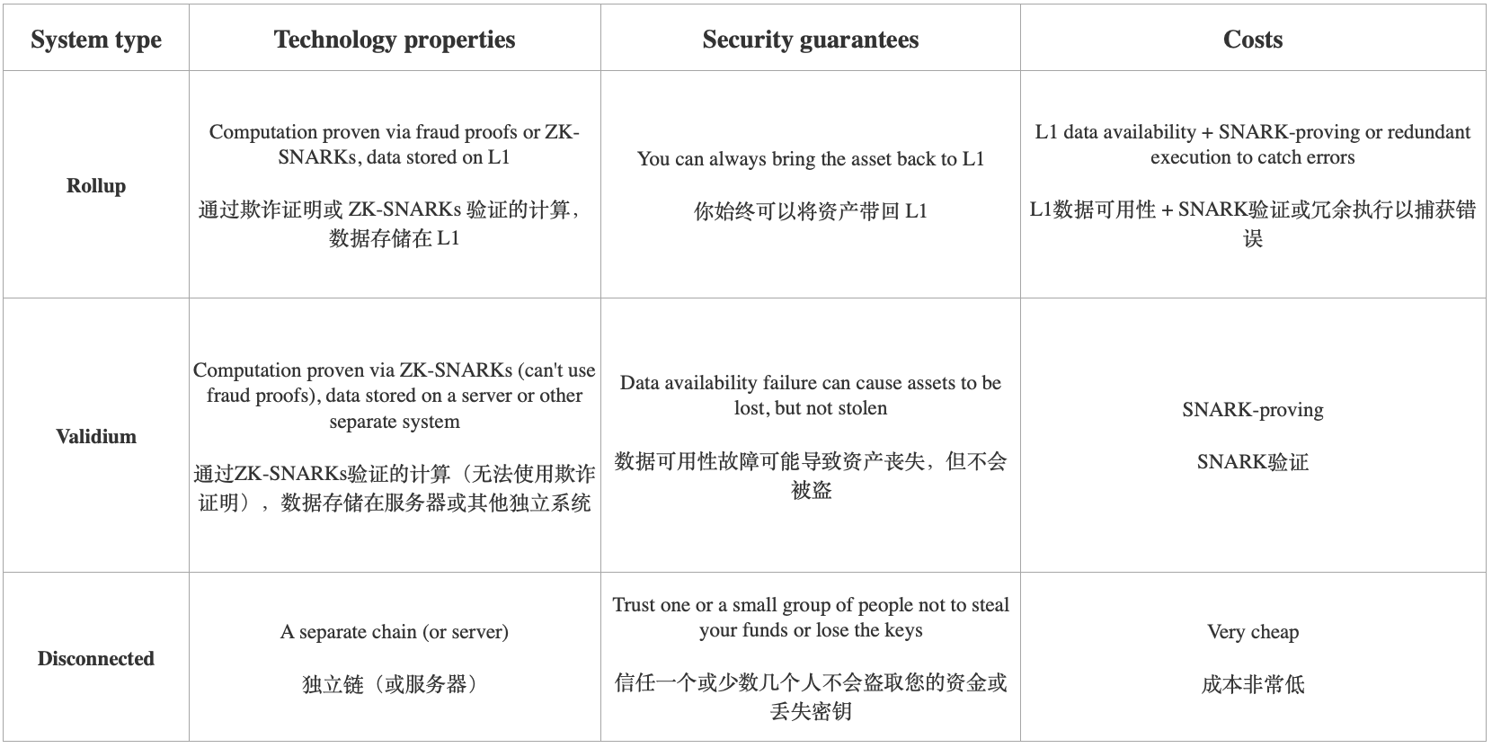 在 plasma 和 validium 之间:一个 Plasma 系统提供类似 rollup 的安全保证,具有链下数据可用性,但它仅支持有限数量的应用程序。一个系统可以提供完整的 EVM,并为那些不使用这些较复杂应用程序的用户提供 Plasma 级别的保证,以及为使用这些应用程序的用户提供 validium 级别的保证。