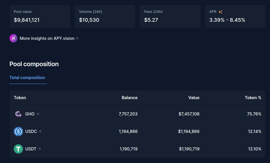 2. 如果您已经在 Balancer GHO 池中提供流动性或用您的 veBAL/vlAURA 票据进行支持,那么请暂时停止这些操作。虽然 Aave/GHO 喜欢 Balancer,但如前所述,目前 stableswap 对 GHO 不利。尽量减少这个池子的规模将有助于减轻恢复锚定价格所需的压力。我们也关注/$crvUSD 池,尽管该池相对较小(30 万美元),所以问题并不紧迫。